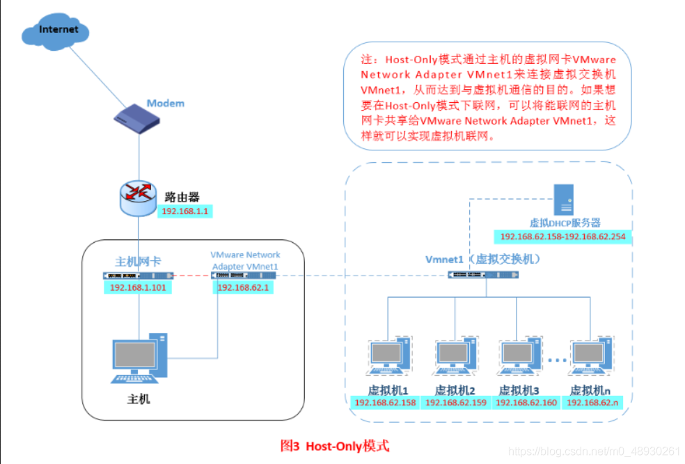 仅主机模式,比NAT模式更加封闭,是一种全封闭的网络模式,它唯一能访问的就是主机。仅主机模式没有NAT服务,所以默认情况下虚拟机网络不能连接到Internet。主机和虚拟机之间的通信是通过VMware Network AdapterVMnet1虚拟网络来实现的。