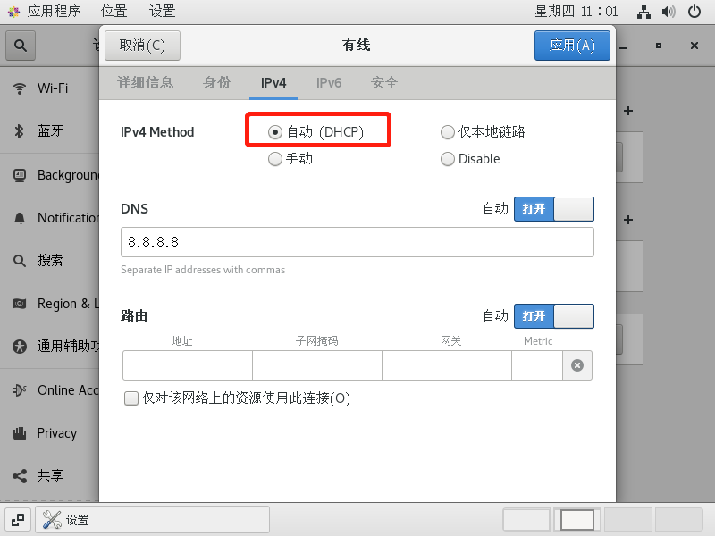 如果你使用的Linux操作系统有图形界面,那么可以直接进行IP配置切换,由手动切换至自动模式,这样虚拟机就会自动获取绑定网卡上的IP地址段内地址作为其虚拟主机IP。
