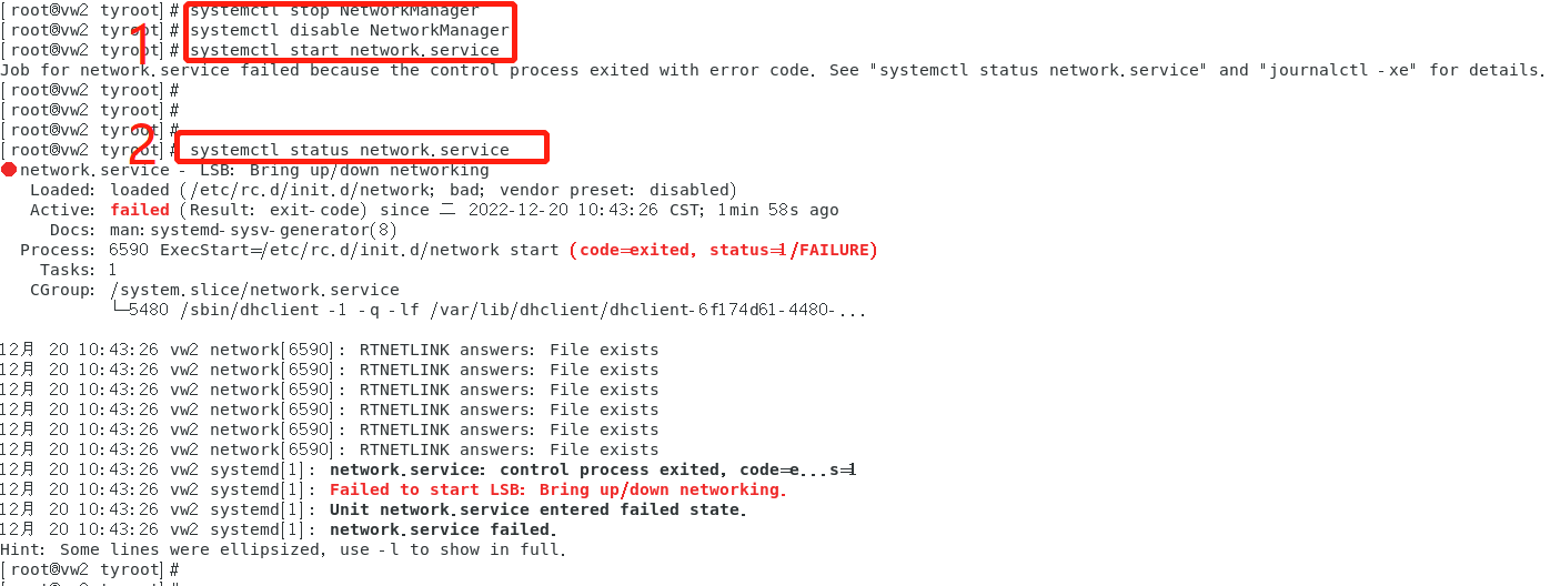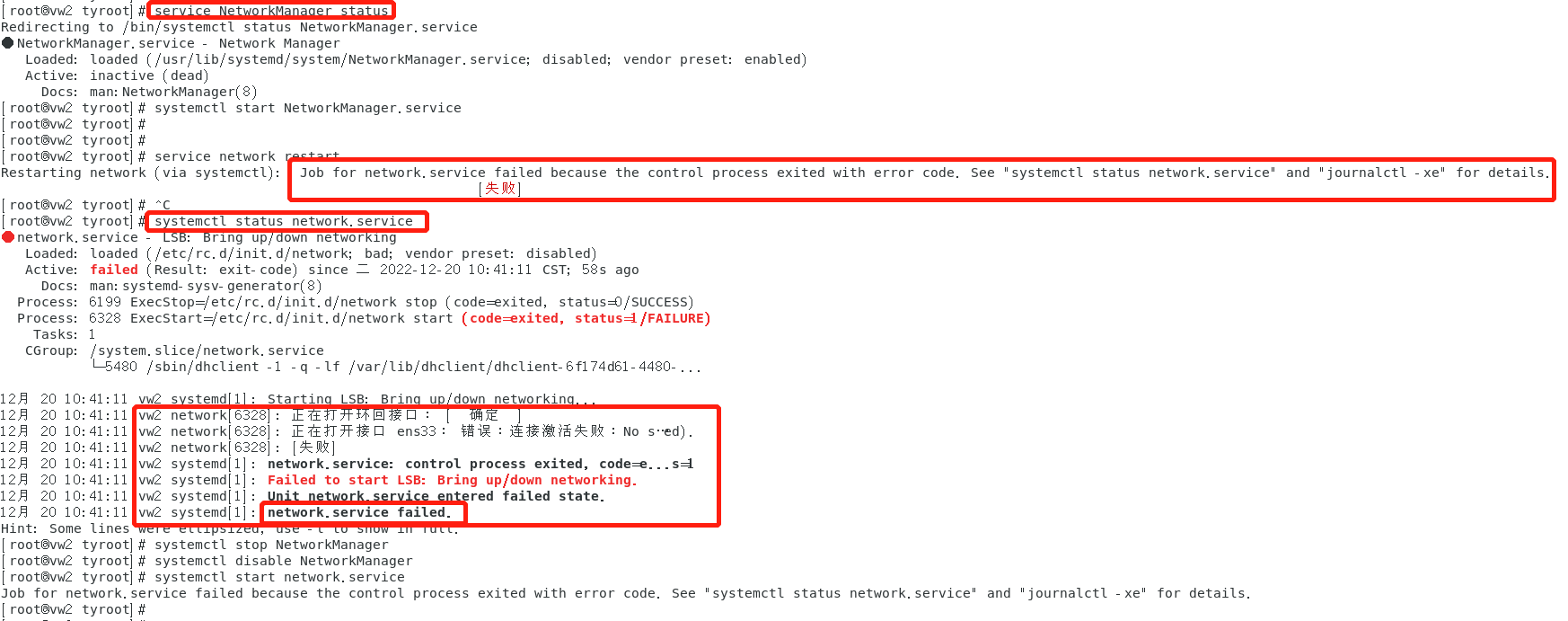 这个故障是NetworkManager和network.service之间相互冲突导致,先分别查看NetworkManager和network.service的状态,均存在失败明细。