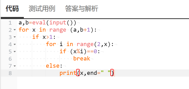 编程实现输出指定范围内的素数,输入以逗号间隔,输出以空格间隔。指定范围由用户输入