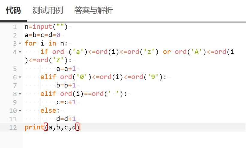 输出:按照顺序输出字母,数字,空格,及其他字符的个数,个数以空格分隔