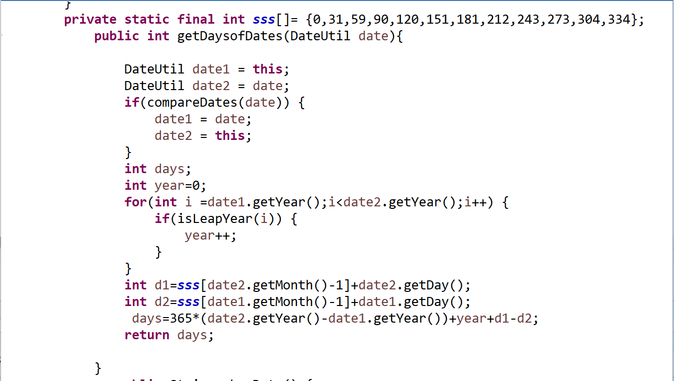 第五题主要在于DateUtil类的构建,主要功能都在这个类中实现,对于得到下n天的功能,先要判断是否是闰年,然后在判断当前日期+天数是否会超过这个月的天数,如果不会则直接相加,反之,则用while循环来判断下n天的日期,一个月一个月,一年一年遍历过去。之后就是把新得到的数据载入DateUtil中,重新定义年月日的日期。再就是判断两个日期相差的天数,先判断两个日期相差的年数,并判断两个日期相差年数中有几个闰年,然后在判断两个日期相差的月数-1,然后再判断两个日期相差的天数,再用365*相差的年数+两个日期年数中闰年的数量+两个日期中月份相差的天数+两个日期相差的天数,最后就得到了两个日期天数的差值。圈复杂度主要是在对于数合理性的判断和对于求下n天上使用了过多的if else 语句,导致圈复杂度达到了18点,可以使用switch语句来减少圈复杂度。