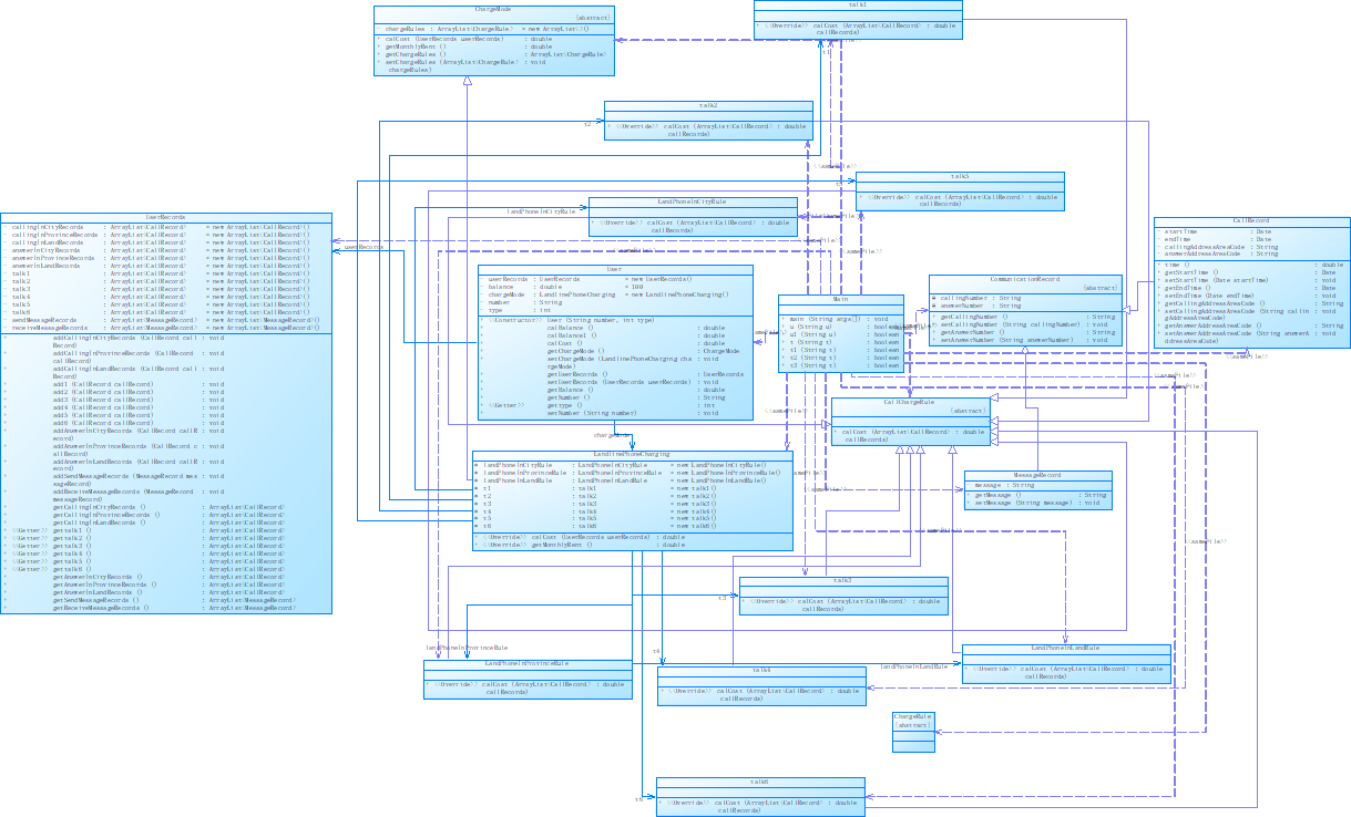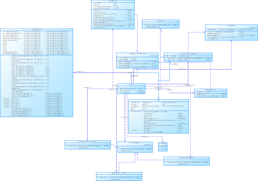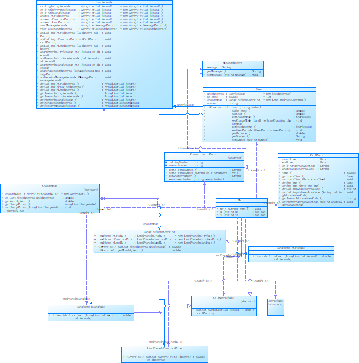 小结:在第一题的基础上加入了手机的开户,并增加了手机计费,手机互相通话,手机与座机通话,由于本题在上一题已经完成的结构上继续进行,作业主要难度在于计费方法的运用。我觉得计费的情况有许多种,这很容易让同学们产生混乱,需要耐心分析,把每个情况考虑在内。