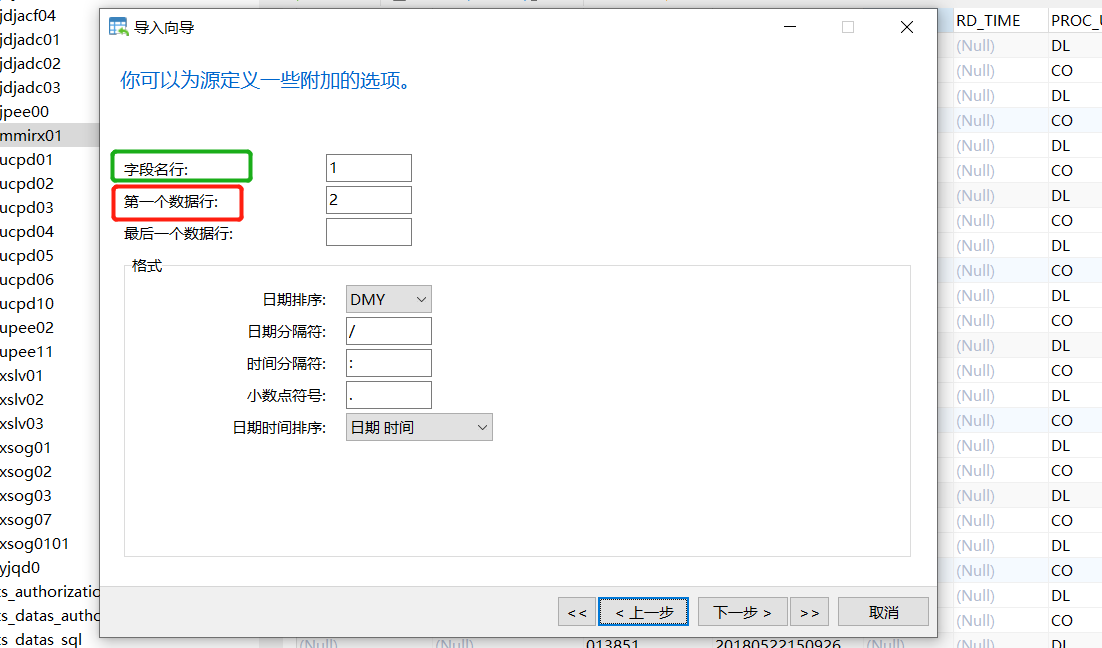 4.按照提示填写之后,中间有个提示框中“字段名行”是excel对应字段所在的行,“第一数据行”是excel第一条数据所在的行,下面日期格式看你的需求,完事之后下一步