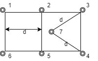 对于 selected[ ] 数组中的每个点,只需要遍历其下方的点,因为它上方点遍历其他点的时候已经把它们之间的距离计算过了,所以只需要考虑下方距离为 d ,左右距离也分别为 d 的矩形区域,如下图。不妨把 mid 线上的点认为属于S1,那么由于左侧正方形区域中最近距离为 d1 ( < d ), 所以左边正方形最多存在1、2、5、6 四个点,如果有第5个点,那就一定会有该点与某个点的距离小于 d1 与左侧最小距离为 d1 矛盾。除 mid 线上的两个点外(已经算在左侧区域中),右侧最多包含3、4、7三个点,其中 7 是分别以3、4为圆心 d2 为半径的圆弧的交点。所以这个矩形区域内,对于某个遍历到的点,最多计算它与其他6个点之间的距离