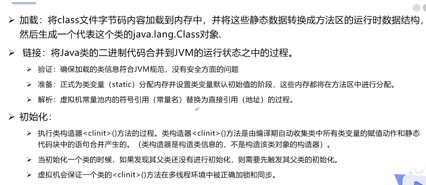 - 类加载的作用:将class文件字节码内容加载到内存中,并将这些静态数据转换成方法区的运行数据结构,然后在堆中生成一个代表这个类的java.lang.Class对象,作为方法区种类数据的访问入口。