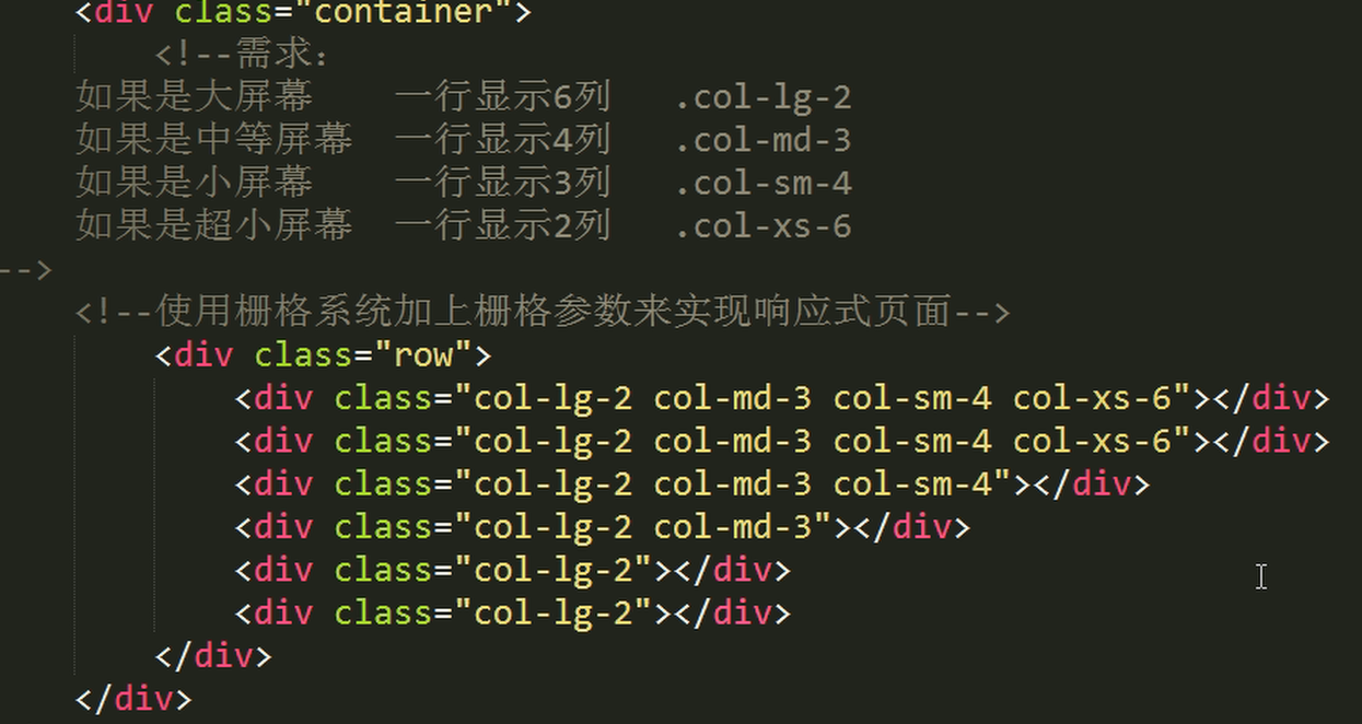 - 案例:大屏 显示12列,中等屏幕显示6列,小屏幕显示3列,超小屏幕显示2列
