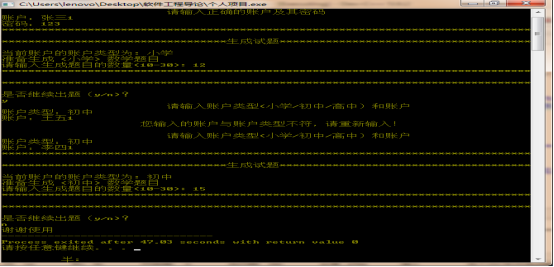 总体分析:其代码基本实现了要求的全部功能,即能完成登录、打印所需数目的试题、试题储存在txt文档中,且能以出题时间为文档命名,文档存在所对应的账户文件夹中,还可以识别账户和账户类型是否对应。