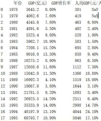1.按行输出每年GDP数据,表头列名如文件第1行所示。