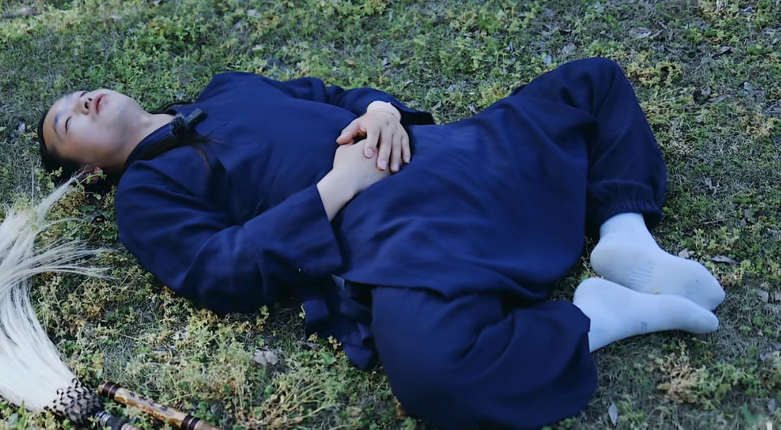 然后躺下,双手放于丹田处,舌顶上颚,能感觉到大腿外侧有拉伸感