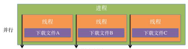 比如同时开启3条线程分别下载3个文件(分别是文件A、文件B、文件C)