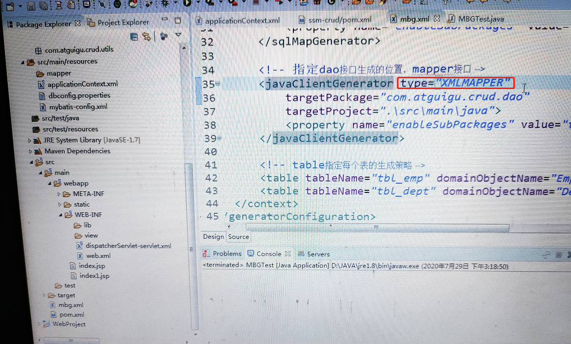 此时由于配置文件mgb.xml中的javaClientGenerator标签缺少了属性"type",需要补上type="XMLMAPPER".