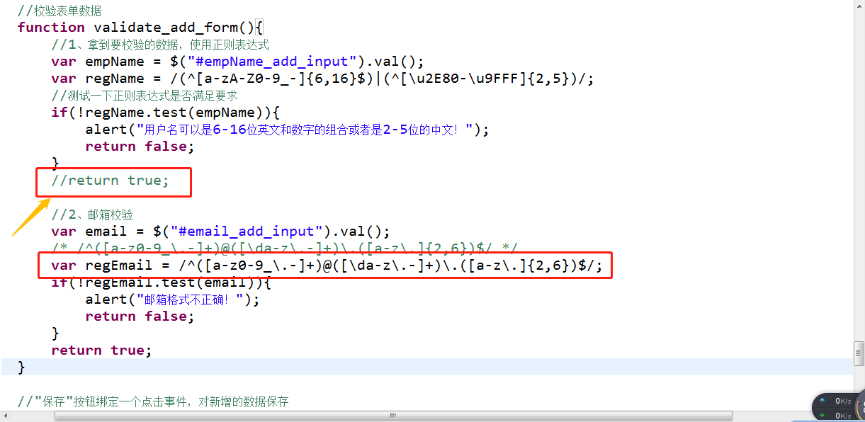 一开始以为是邮箱的正则表达式出了问题,后来专门去学了以下正则表达式,耽误了一天时间,后来一想是不是return语句的原因呢?因为在验证完用户名后就直接返回了true,那后面不管输入的邮箱符不符合规则已经默认返回true,也就是符合规则了。如下图黄色箭头所指: