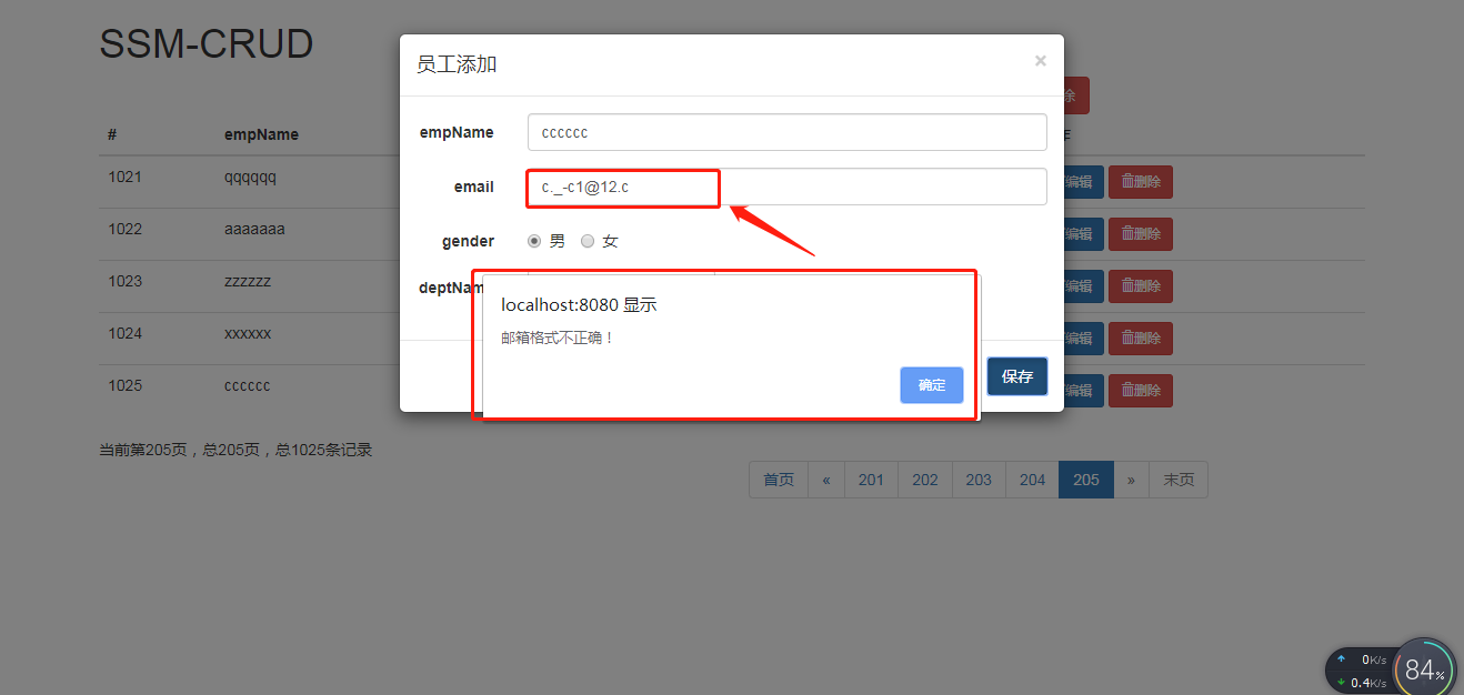 在做SSM-CRUD中的邮箱校验时,为什么不论输不输入邮箱,或者随便怎么输入都能通过校验?是我的正则表达式不对吗?