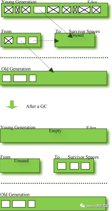 Eden区是一个连续的空间,并且S区总有一个空白的。经过一次GC和复制后,一个S区保留存活对象,而Eden区和另一个S区可直接清空,到下一次GC时,两个S区的角色互换。这就是著名的“停止-复制(Stop-and-copy)”清理法。