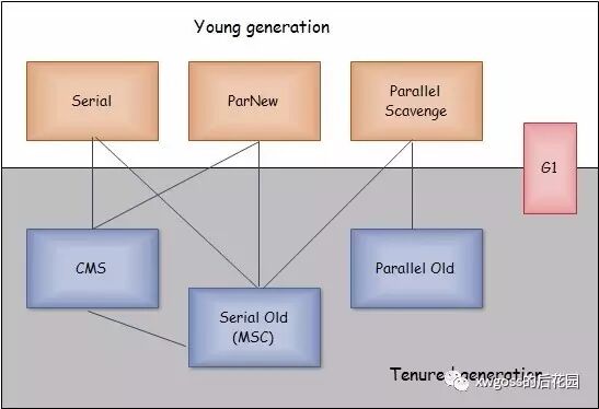 GC收集器是GC的具体实现,目前每个厂商的GC收集器不一样,下图是HotSpot 1.6版本使用的GC收集器如下图(上面是young代可用,下面是old代可用,连线表示可配套用,图来自网上)