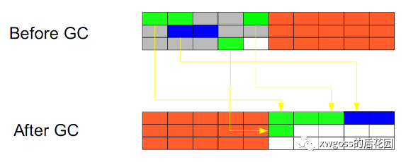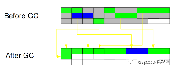 该算法与上个算法类似,分为两个阶段,标记:找到所有正被引用的对象,整理:将所有的标记的对象按照内存地址依序整理放到一起,清理掉末端内存地址之后的内存;该算法的效率虽比不上复制算法,但它不需要额外一样大小的内存区域,同时也不用担心长生命周期的对象来回拷贝的繁琐。