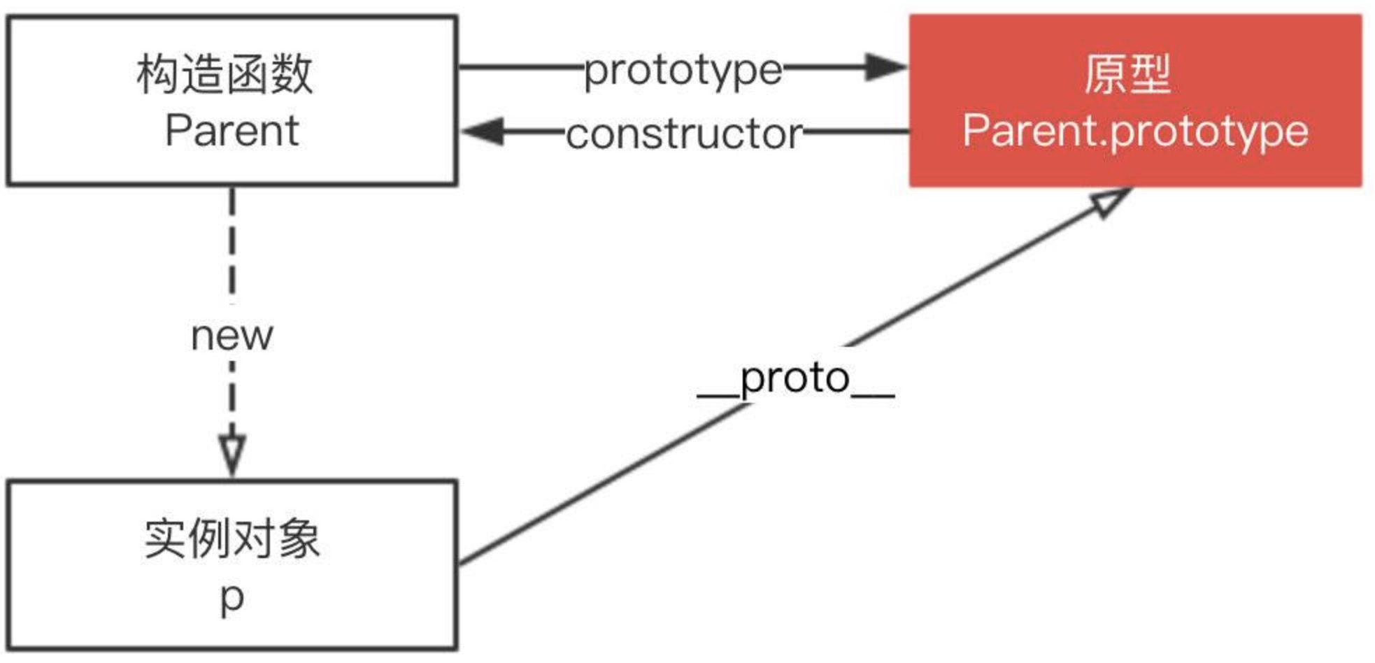 构造函数 Parent、Parent.prototype 和 实例 p 的关系如下:(p.proto === Parent.prototype)