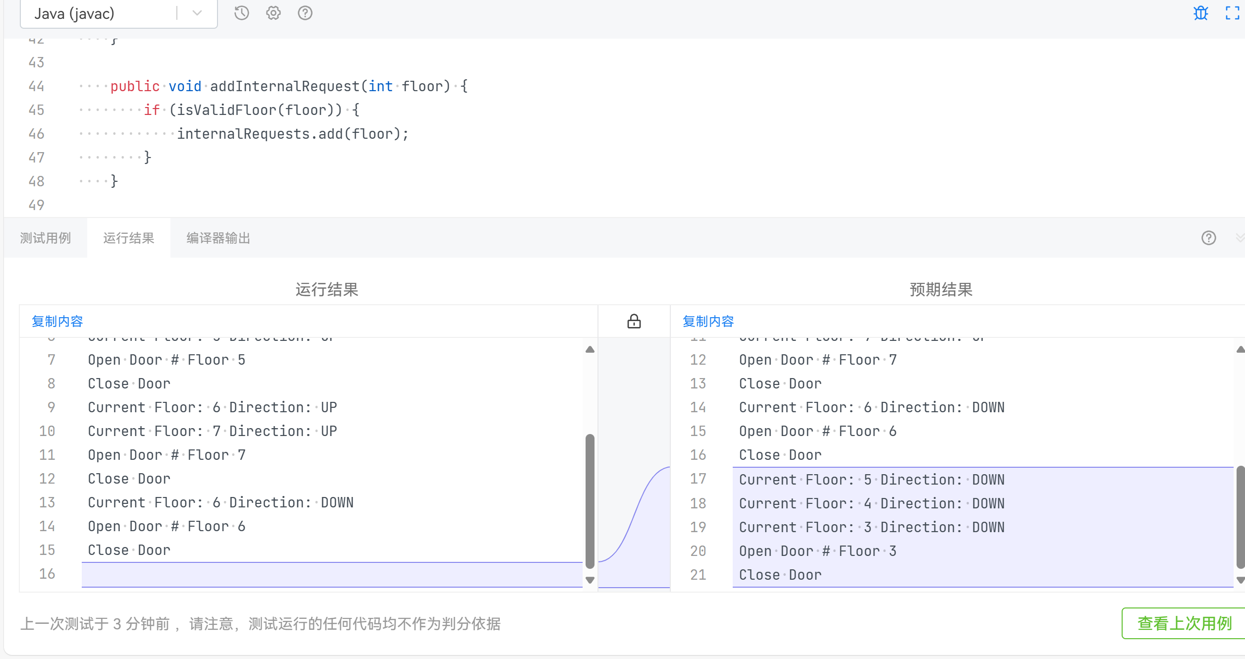 将请求加入列表时,由于逻辑是只加入与前面不同的请求,所以导致第二个三楼没有加入,然后电梯就没有下去,之后我改善了逻辑,改为了与前一个请求不同时加入,就不再出现这种情况