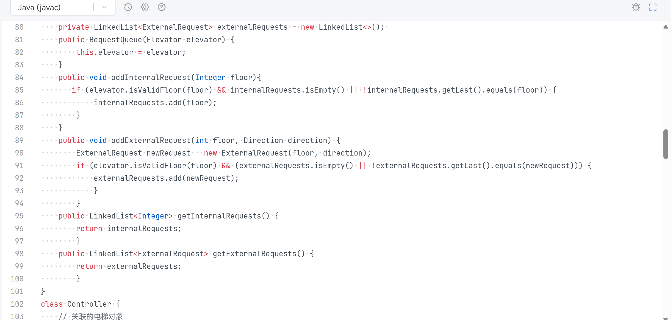 控制器类Controller控制电梯的运行,根据请求队列中的请求来调度电梯的移动。