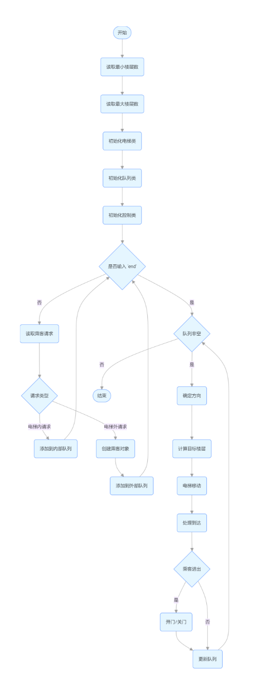 主类,负责读取用户输入,创建电梯、请求队列和控制器对象,并根据用户输入添加请求,最后调用控制器的 move 方法来运行电梯。
