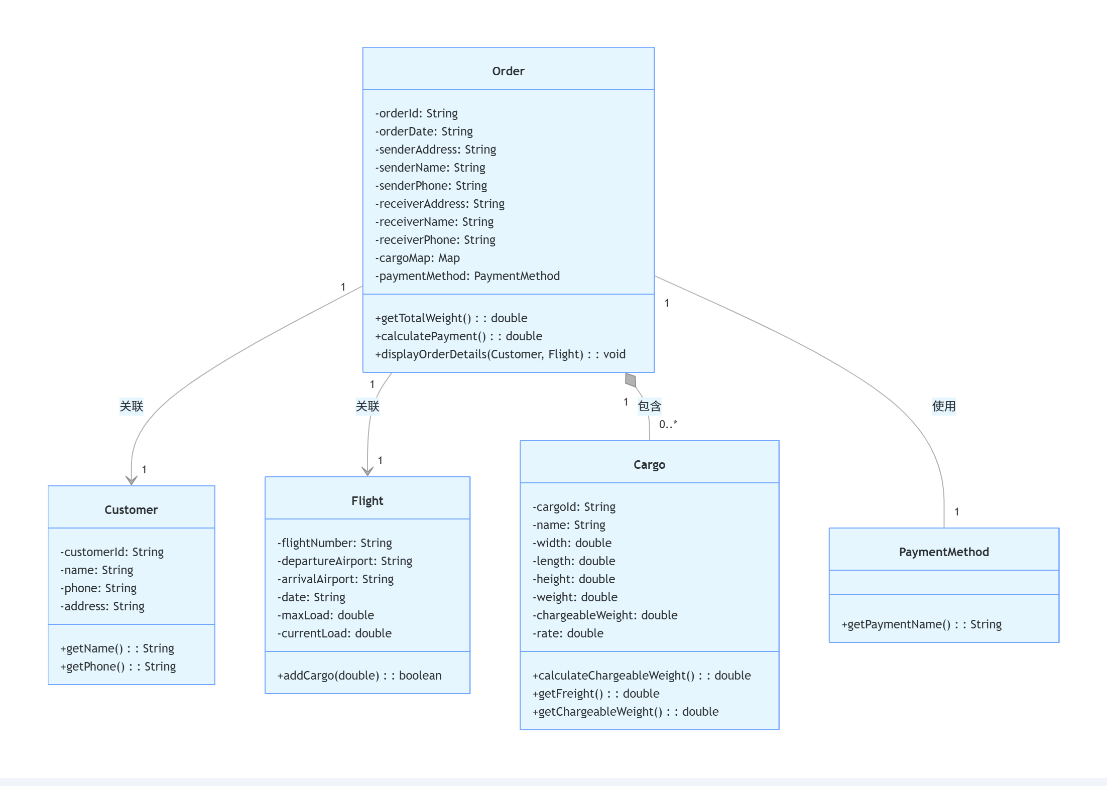整合订单信息,通过displayOrderDetails()方法输出详情,直接依赖Customer和Flight类,耦合度较高。