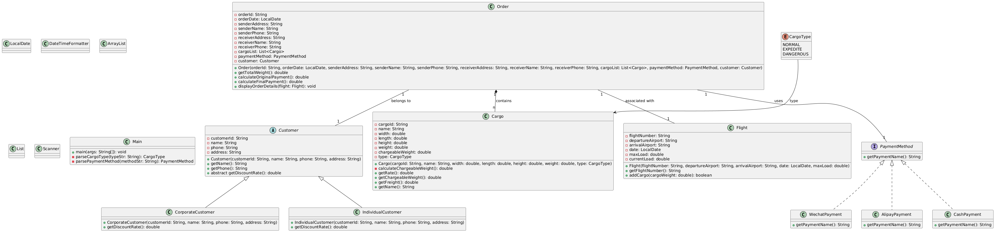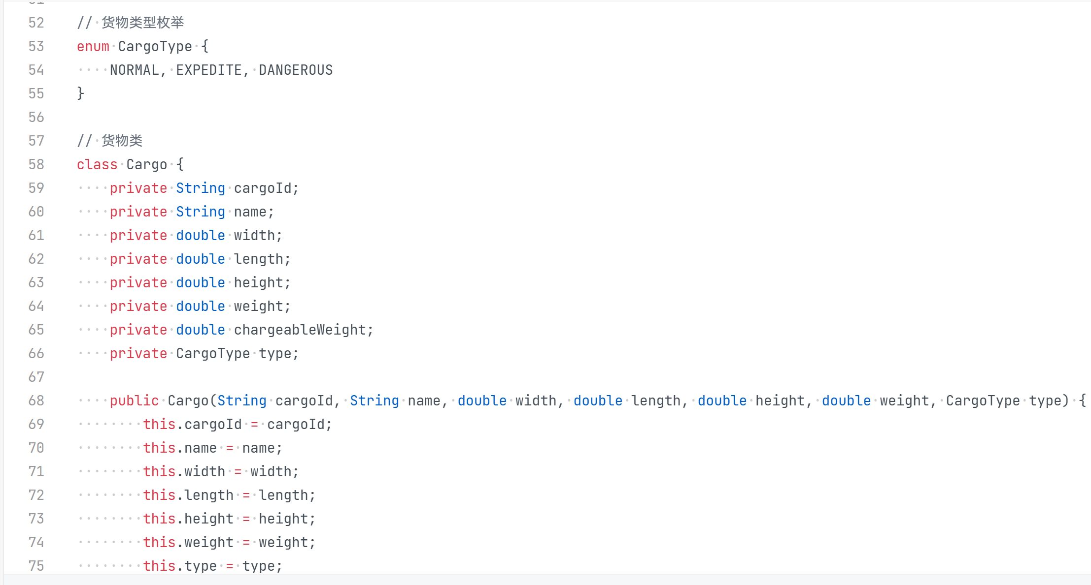 封装的边界把控:在Cargo类中,将计费重量计算封装为私有方法calculateChargeableWeight(),确保外部无法直接修改计算逻辑,同时通过公共方法暴露必要属性(如getChargeableWeight()),平衡了数据安全性与访问便利性。