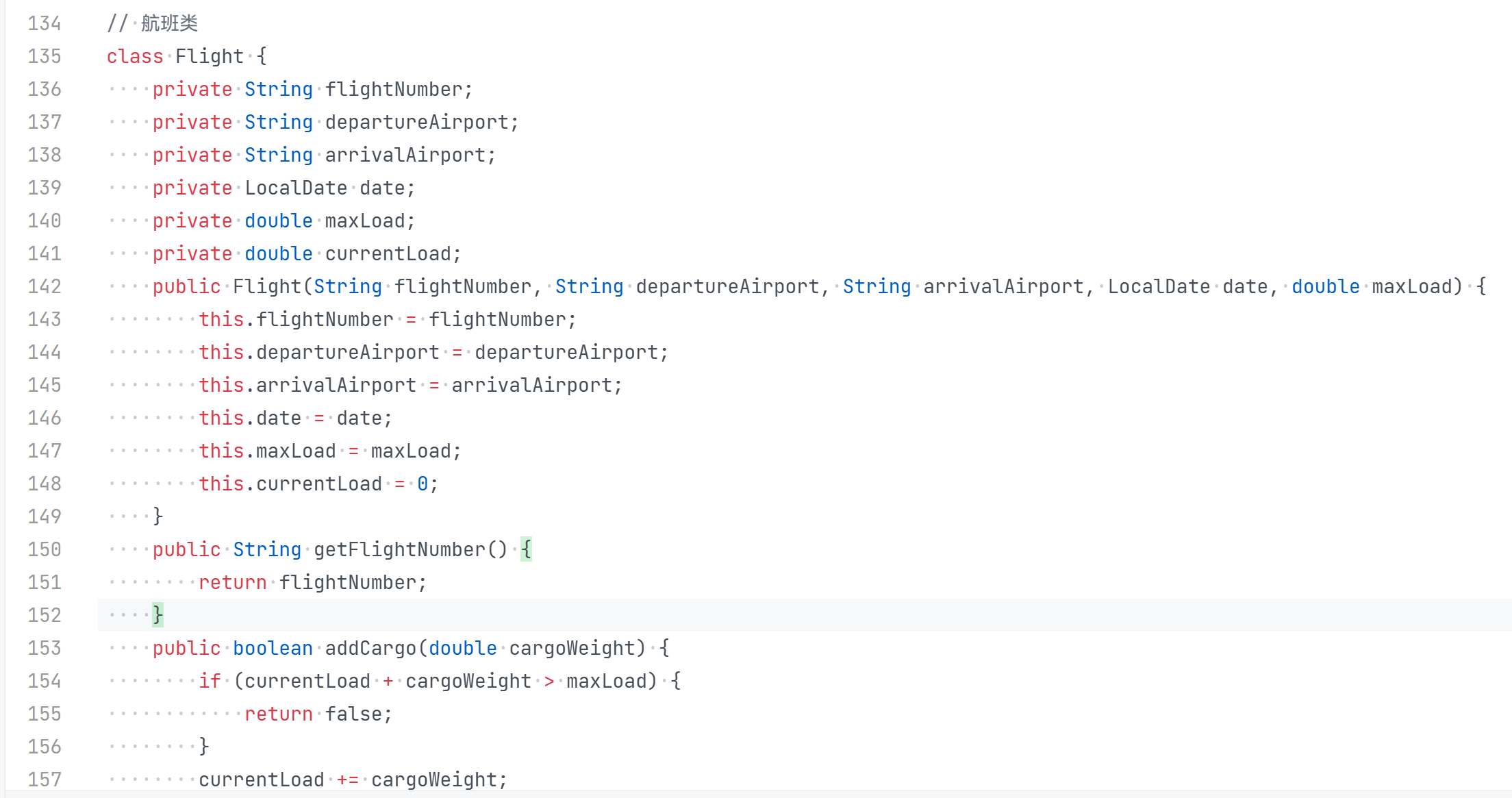 为Flight类的addCargo()方法添加 Javadoc,说明 “返回值表示是否装载成功” 的语义。