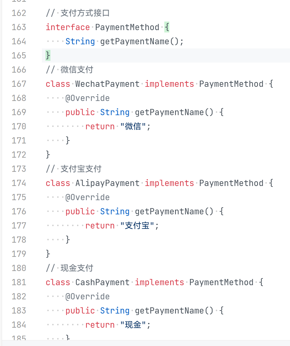 PaymentMethod接口将支付方式抽象为getPaymentName(),微信、支付宝等具体类实现细节,使Order类与支付方式解耦,新增支付方式时只需实现接口,符合开闭原则。