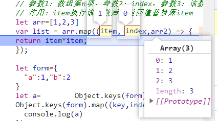 //map是一个用于数组的函数 // 参数1:数组第n项,参数2:index,参数3:该数组 // 作用:item执行该函数后的返回值替换原item let arr=[1,2,3] var list = arr.map((item, index,arr2) => { return item*item; });