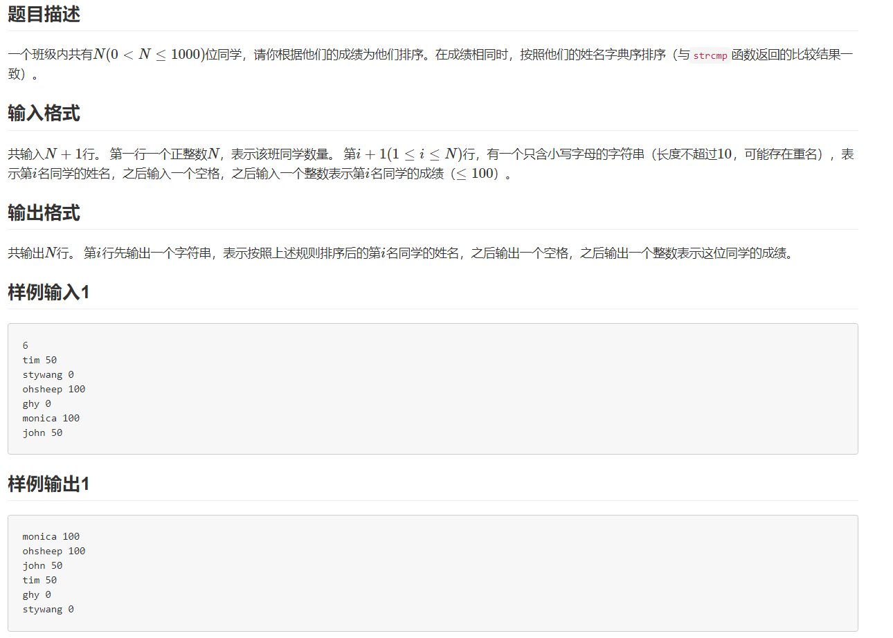 #include<stdio.h> #include<stdlib.h>//qsort在这个函数库里面 #include<string.h> struct in{//结构体变量,存储每个人的成绩和名字 int score;//成绩 char name[15];//姓名 }a[1005]; int cmp(const void *p,const void *q);{//qsort的比较函数,用于确定比较规则 int main(){ int n; scanf("%d",&n); for(int i=1;i<=n;++i){//读入 scanf("%s %d",a[i].name,&a[i].score);//这个是结构体变量的引用,下面会仔细讲 } qsort(a+1,n,sizeof(a[1]),cmp);//直接qsort排序就行了,是不是很方便hh for(int i=1;i<=n;++i){//输出 printf("%s %d\n",a[i].name,a[i].score); } /*主函数里面其实相当简单对吧,读入以后直接排序,排完序输出就可以了*/ } int cmp(const void *p,const void *q){ struct in c=*(struct in*)p; struct in d=*(struct in*)q;//定义结构体c和结构体d来存储p和q中的值,就是套路,记下来用多了就明白了 if(c.score!=d.score){//先比较成绩,再比较姓名字典序 return c.score>d.score?-1:1;// } else return strcmp(c.name,d.name);//否则直接返回strcmp的值就行了,这就是按字典序排序 }