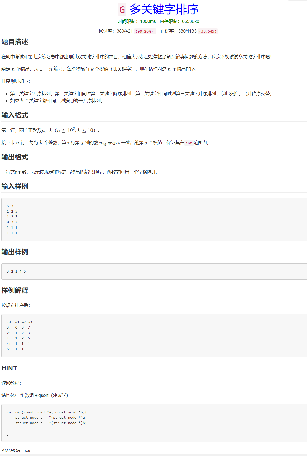 嗯,这个就差不多是多关键字排序了,其实就是结构体多添几个变量,cmp函数里面多写几个if else 而已hh;