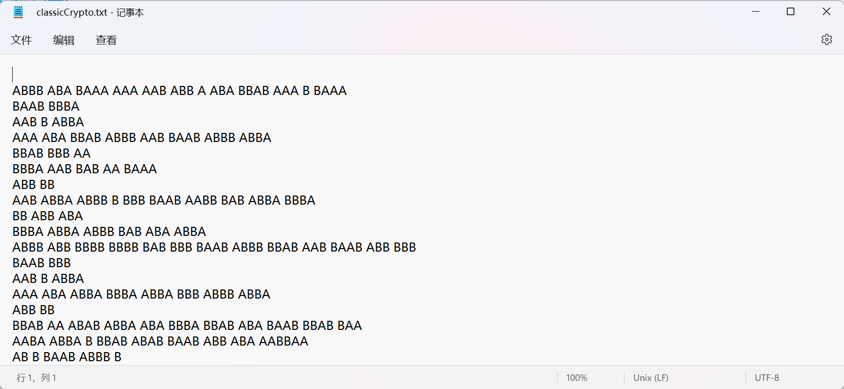 打开附件,看到一堆AB,一开始想是二进制,尝试解密,发现不对。后来想到应该是个摩斯密码,把A换成- B改成.最后放在CyberChef中进行解密