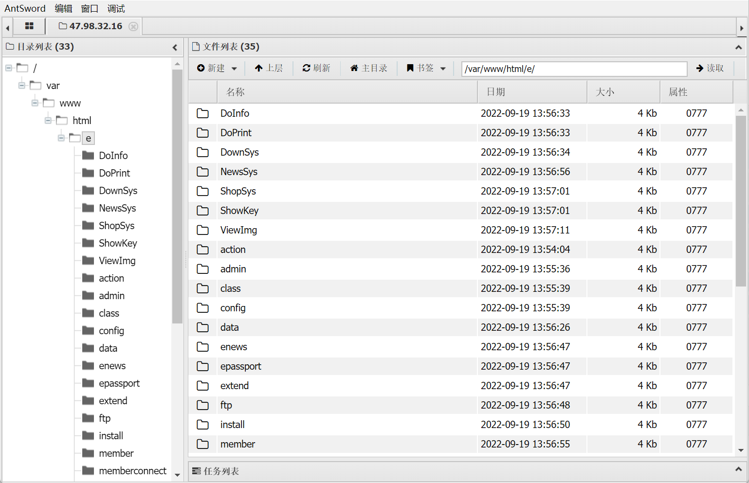 看到这里,心想,这就简单了,他在/e目录下上传了一句话木马,直接蚁剑去连接,密码为a