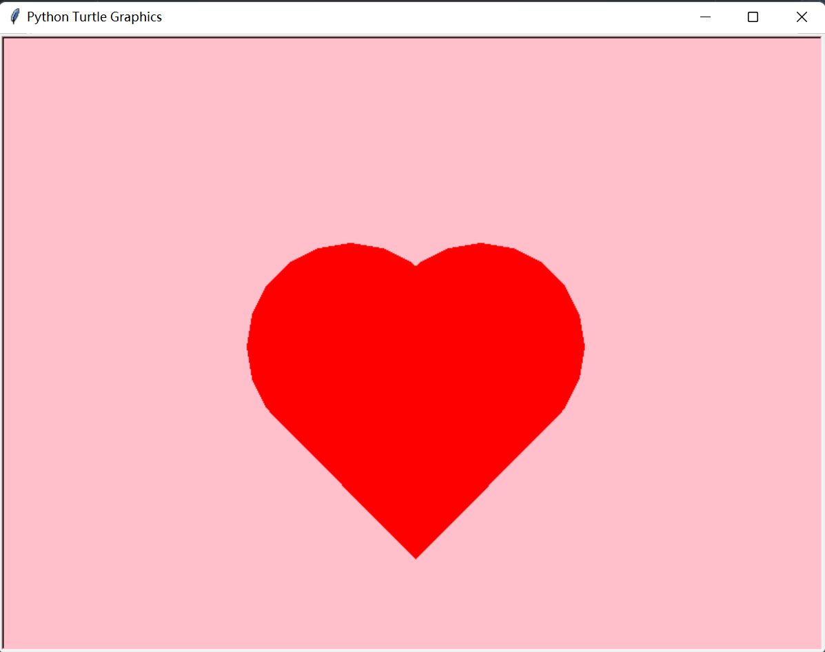 from turtle import * from math import sqrt width, height = 800, 600 screen = Screen() # 创建窗口对象 screen.setup(width, height) # 设置窗口的宽高 screen.delay(0) # 设置无延时绘画 screen.bgcolor('pink') # 设置背景颜色为粉色 # 设置画笔的统一属性 t = Turtle(visible=False, shape='circle') t.shapesize(10, 10) t.pencolor('red') t.fillcolor('red') t.penup() # 克隆一个圆形,设置位置 circle1 = t.clone() circle1.goto(-sqrt(10*10*160)/2, 0) # 克隆第二个圆形,设置位置 circle2 = t.clone() circle2.goto(sqrt(10*10*160)/2, 0) # 克隆一个正方形,设置位置并旋转角度 square = t.clone() square.shape("square") square.setheading(45) square.goto(0, -sqrt(10*10*160)/2) # 显示图形 circle1.showturtle() circle2.showturtle() square.showturtle() done()