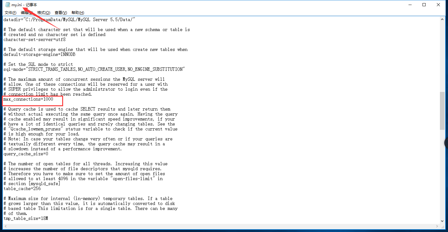 发现连接数是100,估计100不够用,那就再改大一点吧,我改成1000这总可以了吧(在 MySQL 目录下的my.ini文件,修改后记得重启 MySQL 服务)。