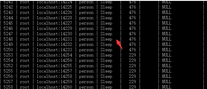 列出当前数据库的连接数及详细信息。发现我的连接数全是连到 Person 这个数据库,但是这些连接数全是 Sleep 的状态,而且足足有 1000 个。
