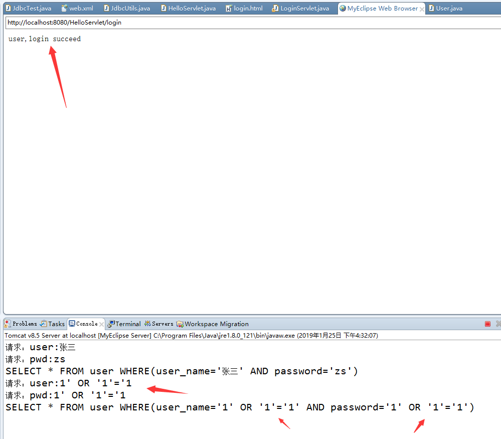 如上代码中的 sql 语句: SELECT * FROM user WHERE(user_name='" + user + "' AND password='" + pwd + "'),看似没有任何问题,但配合着 Statement 就会出现漏洞了。接着我们来测试 SQL 注入。