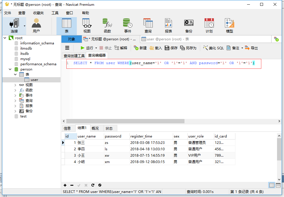 sql 语句变成如上图控制台打印出来的那样,我们拿到数据库软件中跑一下,也是可以查出来。后面的 ‘1’ = ‘1’ 为真,这句 sql 语句其实变成了 SELECT * FROM user ,结果也就是查询出 user 所有数据信息。