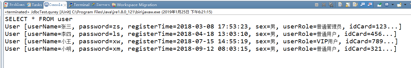 这样的确可以获取到 user 表,但是这个方法并不能通用。例如:我想查询 student 表时,student 表中字段名与 user 表肯定不一样,这样就会产生错误。所以,这种情况就可以利用 Java 反射来实现。可是,User 类中的变量相当于 user 表中的列名,如果让 User 类将变量名强制写成 user 表中一样,那就显得很局限,不能够通配。那么,就得用到 JDBC 提供的另一个接口了。
