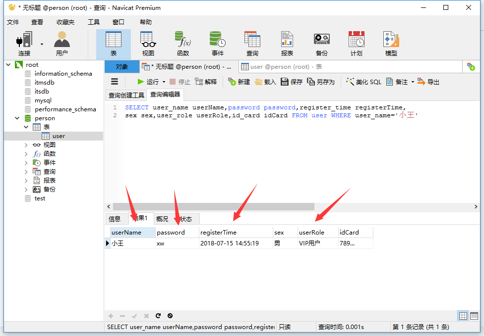 比如我要查询 user 表中 ‘小王’ 的详细信息,原本的 sql 语句: