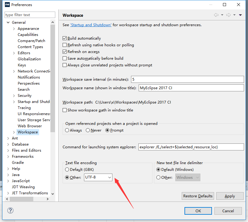 破解成功以后就是MyEclipse的环境配置了,首先修改的就是默认的编码格式:(工具栏->window-preferences)
