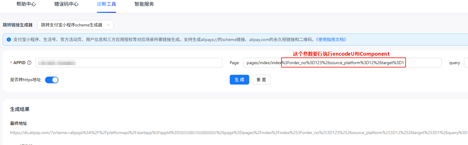 在使用小程序提供的生成外连跳转工具的时候在设置Page参数的时候,如果要通过URL传参数,要记得参数先执行encodeURIComponent处理再拼接在url后,如果要走启动参数query,也是同理的