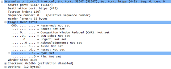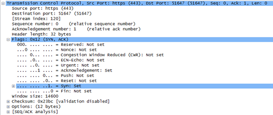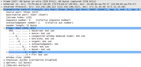 Checksum:0x12bc 校验和用于校验TCP报头部分和数据部分的正确性。