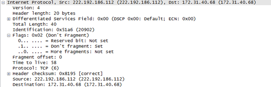 Flags:0x02 (DF位:为1表示不分片,MF为0表示这是最后一片);