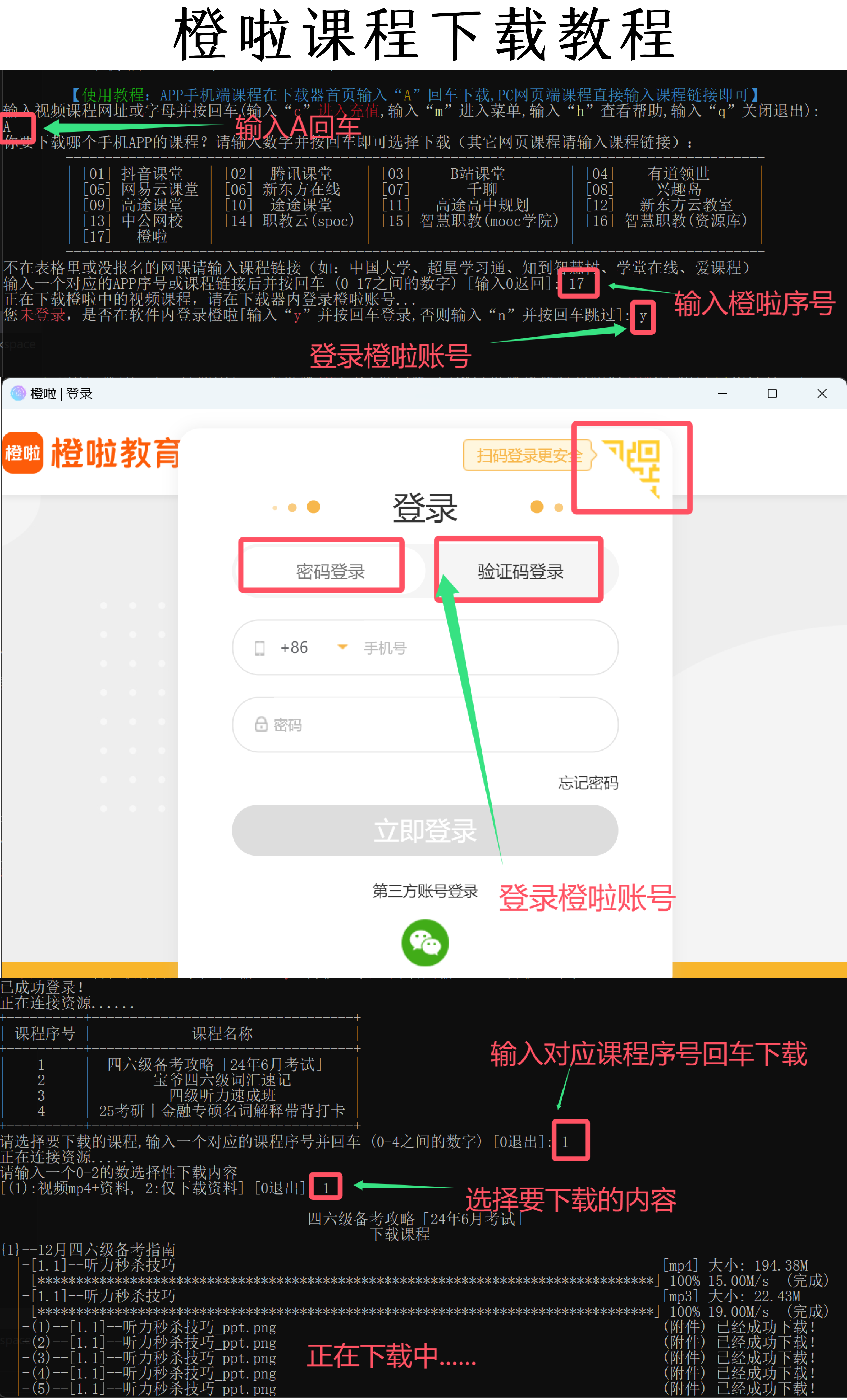 2.在下载器首页输入A,选择橙啦对应的APP序号后回车,在弹窗中登录橙啦账号,再输入课程序号回车,即可下载