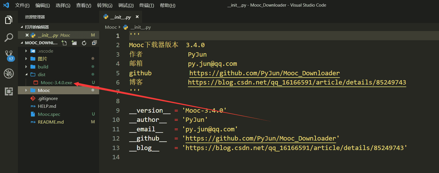 - 最后会在项目工程根目录下出现一个dist文件夹,该文件夹会出现一个Mooc-3.4.0.exe程序