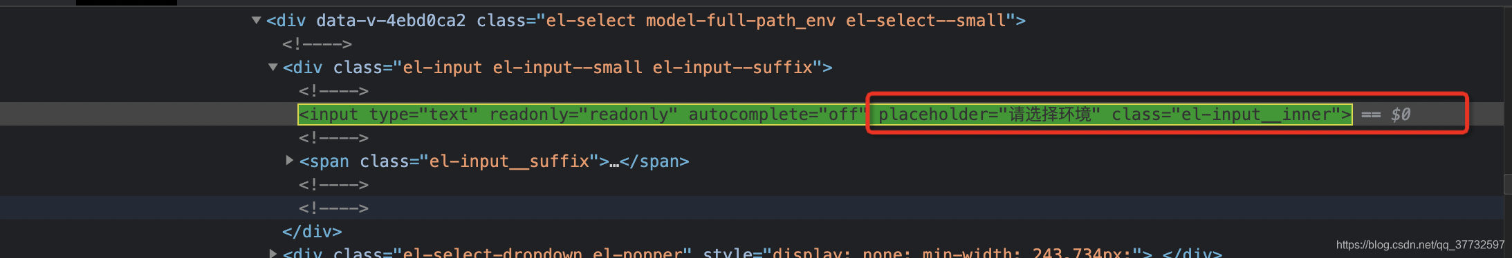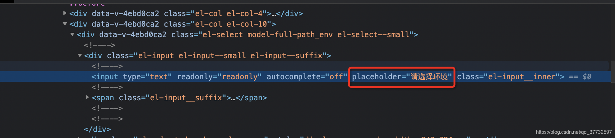 1 - css定位:input.el-input__inner[placeholder=请选择环境] 2 即:标签.XXX[标识=YYY] 3 4 - xpath定位://input[@class="el-input__inner" and @placeholder="请选择环境"] 5 即://标签[@class="XXX" and @标识="YYY"]