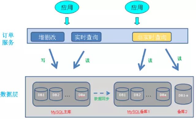 原来一个Oracle库被多个MySQL库取代,支持1主多备和读写分离,主备之间通过MySQL自带的数据同步机制(SLA<1秒),所有应用通过订单服务访问订单数据。