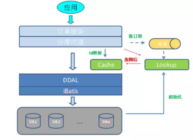 Lookup表用于订单Id/用户Id映射,保证按订单Id访问时,可以直接落到单个库,Cache是Lookup的内存数据映像,提升性能,cache故障时,直接访问Lookup表。